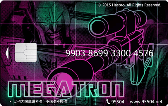 這款產品是由歐洲設計團隊構思,采用鐳射鏡面卡基,使用世界少有的高清8色20倍縮印技術,這款卡的卡芯為稀有銀色芯片,在全世界,萬分之九千九百九十九的卡片都會采用銅色芯片,相比銅色芯片,其導電性更好,識別性更靈敏,耐腐蝕性更強。變形金剛LOGO選用了獨特的立金技術,均由手工粘貼而成,每一張卡都可謂是獨一無二。正面為狂派霸天虎首領威震天的機器人形態,其即將向汽車人發射激光炮的動態場景,展示了威震天作為狂派領袖的強大與威嚴;背面為威震天在經典G1動畫里變形成為的一把P-38式手槍形象,將大家的思緒帶回到最初的青春歲月。