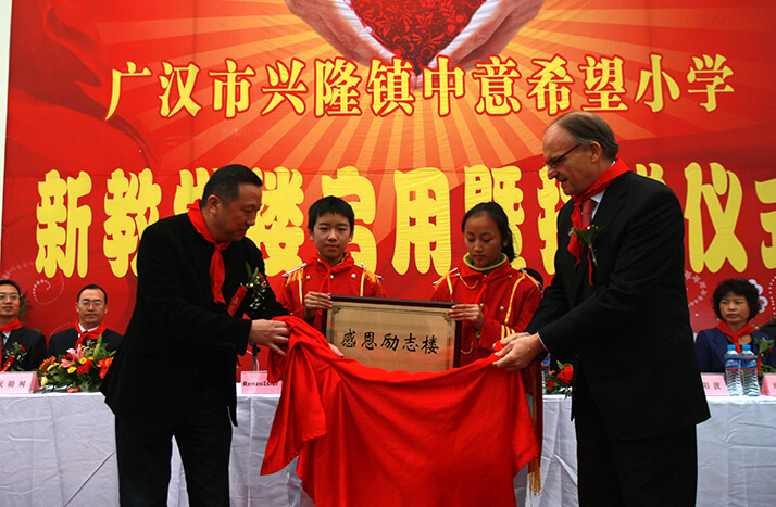 2008年"5.12大地震"發(fā)生后僅兩日,中意人壽即決定以公司名義向中國紅十字會(huì)捐款30萬元,幫助災(zāi)區(qū)同胞度過難關(guān)。此外,中意人壽員工也積極響應(yīng),紛紛慷慨解囊,向中國紅十字會(huì)捐款21萬余元。后中意人壽又以公司名義捐款50萬元,通過四川省青少年發(fā)展基金會(huì)于2009年在四川省廣漢市興隆鎮(zhèn)建設(shè)"中意希望小學(xué)",幫助四川地震災(zāi)區(qū)的孩子們重返校園。