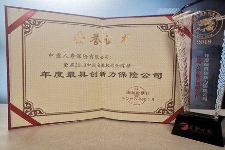 中意人壽在金融時(shí)報(bào)社與中國(guó)社會(huì)科學(xué)院金融研究所主辦的“中國(guó)金融機(jī)構(gòu)金牌榜●金龍獎(jiǎng)”活動(dòng)中獲得“2018年度最具創(chuàng)新力保險(xiǎn)公司”的殊榮。