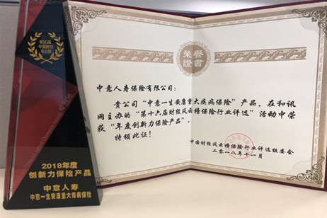 中意人壽“中意一生安康重大疾病保險(xiǎn)產(chǎn)品”在和訊網(wǎng)主辦的“第十六屆財(cái)經(jīng)風(fēng)云榜保險(xiǎn)行業(yè)評(píng)選”活動(dòng)中獲得“年度創(chuàng)新力產(chǎn)品“的榮譽(yù)。