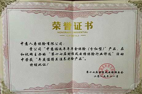 中意福運(yùn)年年年金保險(xiǎn)(分紅型)獲“年度值得關(guān)注養(yǎng)老險(xiǎn)產(chǎn)品”--證書(shū)