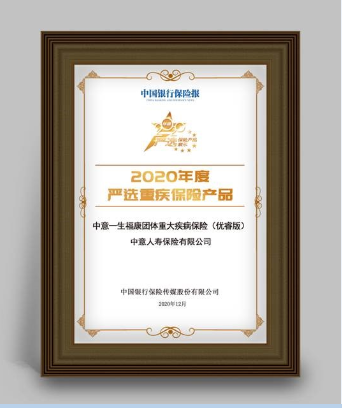 【新聞】中意人壽“一生福康” 榮獲“2020年度嚴(yán)選重疾保險產(chǎn)品”獎項