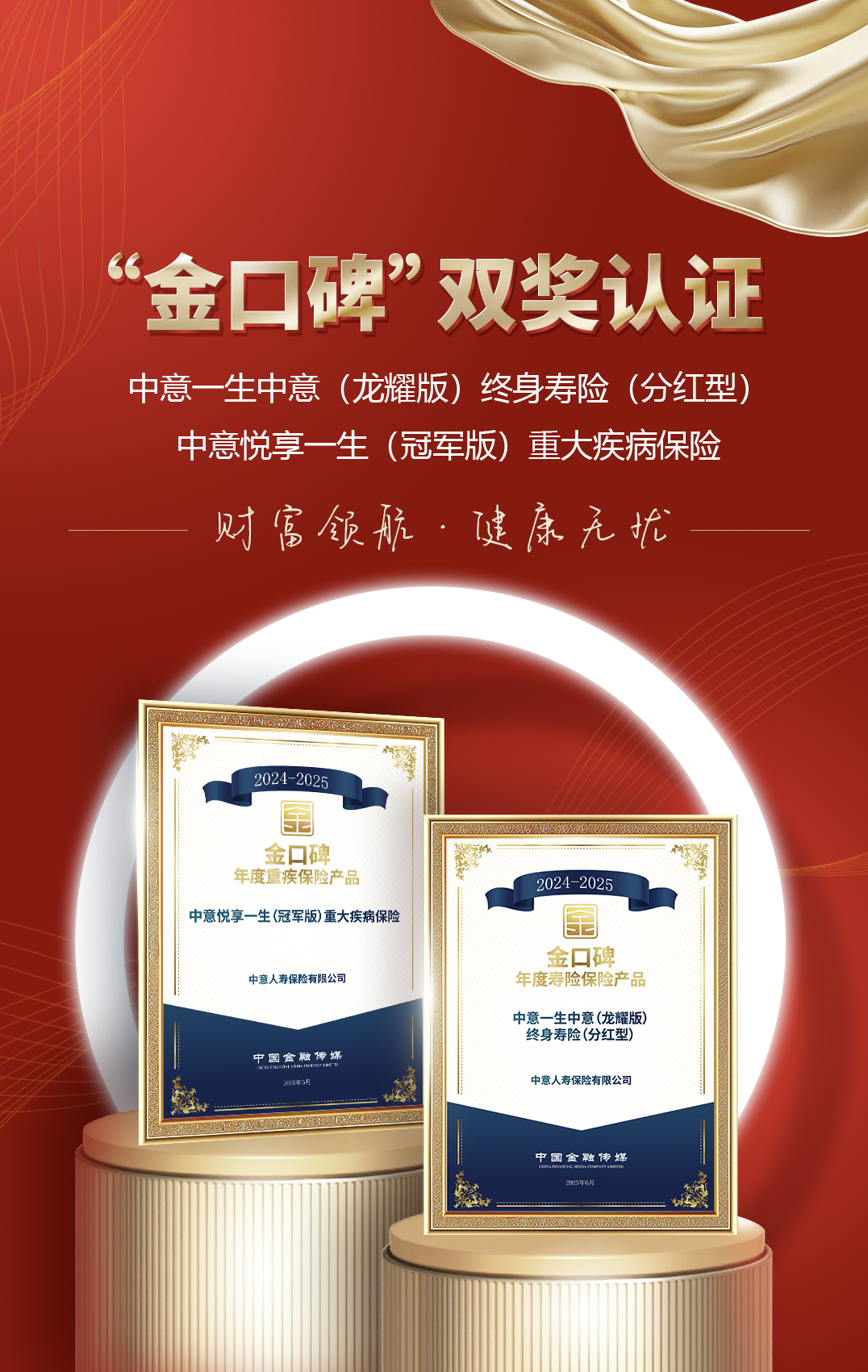 在《中國銀行保險(xiǎn)報(bào)》近期發(fā)布的2024-2025“金口碑”年度保險(xiǎn)產(chǎn)品名單中,公司的中意一生中意(龍耀版)終身壽險(xiǎn)(分紅型)和中意悅享一生(冠軍版)重大疾病保險(xiǎn),分別獲評(píng)“金口碑”年度壽險(xiǎn)保險(xiǎn)產(chǎn)品及“金口碑”年度重疾保險(xiǎn)產(chǎn)品。本次獲評(píng)“金口碑”年度保險(xiǎn)產(chǎn)品,既是行業(yè)和市場對(duì)公司壽險(xiǎn)及重疾險(xiǎn)核心產(chǎn)品競爭力的認(rèn)可,亦是公司綜合實(shí)力的有力見證。