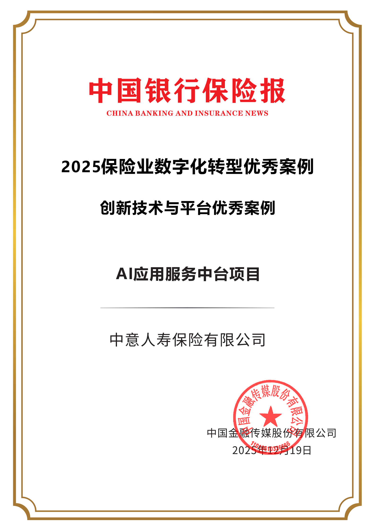 近日,在《中國銀行保險(xiǎn)報(bào)》主辦的“2025金融業(yè)(保險(xiǎn))數(shù)字化轉(zhuǎn)型大會(huì)”上,中意人壽自主研發(fā)的“AI應(yīng)用服務(wù)中臺(tái)項(xiàng)目”憑借鮮明的創(chuàng)新價(jià)值與扎實(shí)的實(shí)踐成效,成功入選“2025年保險(xiǎn)業(yè)數(shù)字化轉(zhuǎn)型優(yōu)秀案例”,這標(biāo)志著公司的科技戰(zhàn)略已從基礎(chǔ)構(gòu)建邁入多場景賦能的新階段,同時(shí)也為行業(yè)整體的數(shù)字化轉(zhuǎn)型提供了參考。