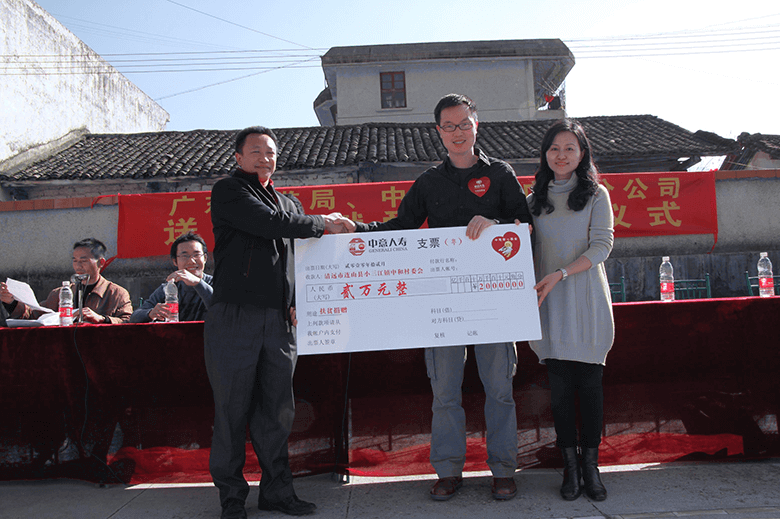 廣東省清遠市連山縣小三江鎮中和村是廣東保監局聯手廣東保險業對口幫扶的廣東最貧困的村莊之一。2010年12月,中意人壽愛心公益基金向中和村委會捐贈兩萬元現金,并向村民們贈送了嶄新的棉被共126床。一年后,中意人壽愛心公益基金向中和村小學健康安全用水改建工程捐助一萬三千余元,并向該村50戶殘疾人家庭贈送暖水壺。兩次活動捐贈總金額約7萬元。
