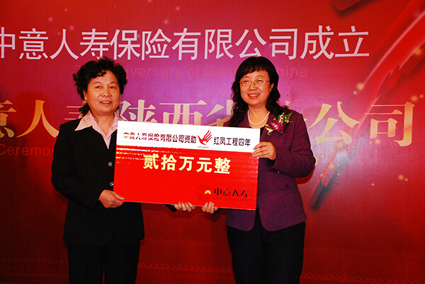 2009年2月,中意人壽向陜西婦聯“紅鳳工程”捐款20萬元,資助貧困女大學生完成學業。并于同年4月和10月分別舉辦了“中意人壽·紅鳳工程 資助生見面會”和“中意人壽2009紅鳳生金秋見面會”。受資助女大學生與中意人壽員工的每一次見面,都在真誠的歡笑和感動的淚水中結束,大家一起續寫著彼此濃濃的情意。