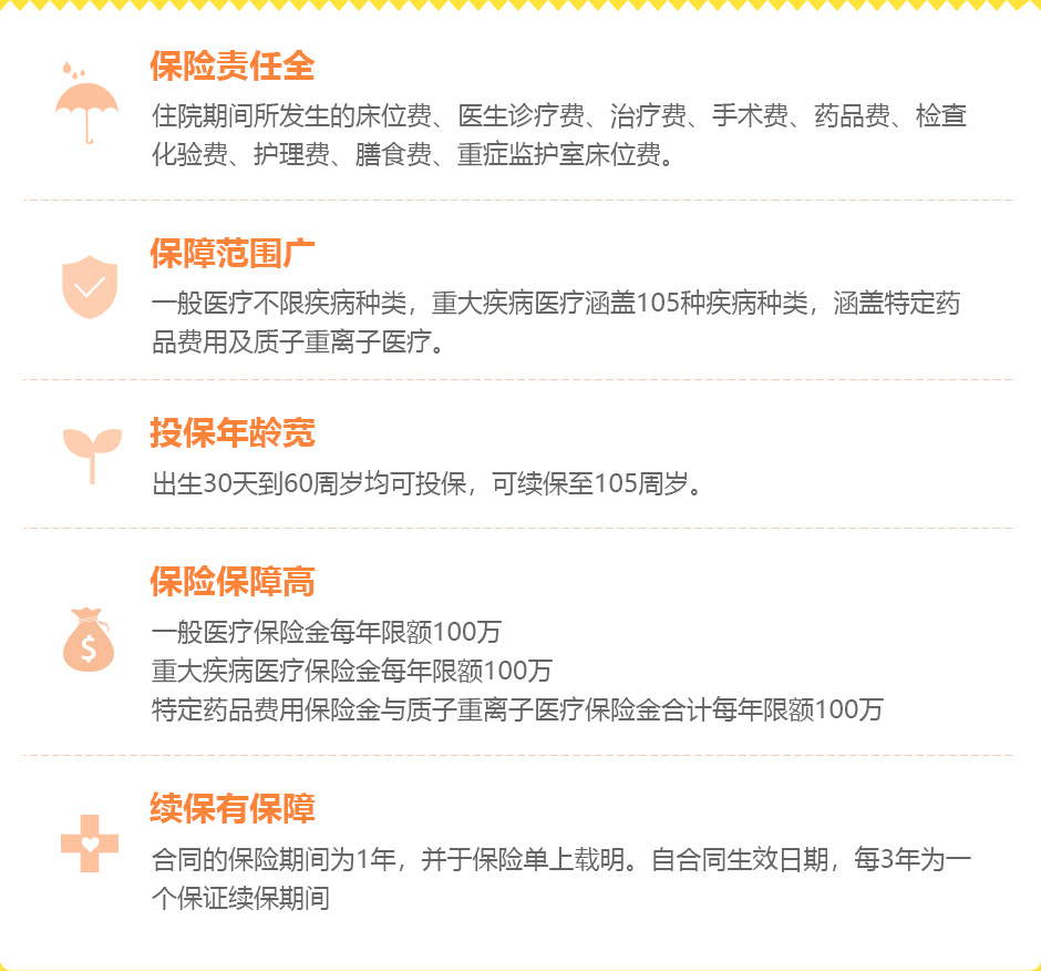 投保年齡:首次投保出生30天-60周歲,最長可續(xù)保至105周歲